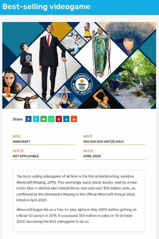 恐怖的是,这一成绩最初于吉尼斯世界纪录在2025年4月报道,直到最近才被Mojang Studios在《我的世界年度报告2026》中确认属实。相比2023年10月首次突破3亿份的纪录,《我的世界》又增长了惊人的5000万份,这一成就至今无人能及!