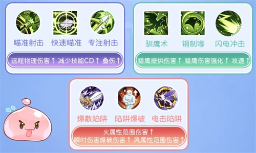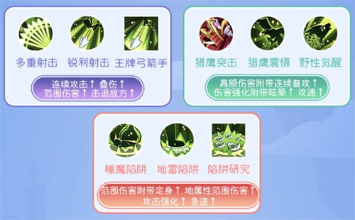 1、弓箭手阶段,解锁风、地、火等各种元素箭矢技能,可以在使用技能时获得元素克制影响,还带有持续伤害及降低物防等效果。