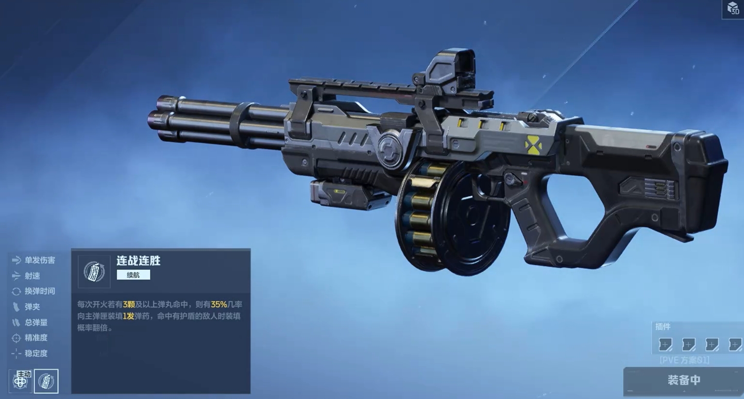 以全服可获取的霰弹枪“飓风之锤”为例:其主动技能为四连发射击,被动效果为每次发射3发弹药后,有概率自动补充1发弹药。据此分析——一号位选用“扩容弹匣”,同步提升弹匣容量与换弹速度,缓解高频射击下的续航压力;二号位搭配“多重激发”,使其每次开火均可触发多次伤害判定,高效激活四连发技能的充能节奏;三号位锁定“近距增幅”,强化其作为近战霰弹武器的核心输出能力;四号位推荐“杀戮连锁”,该插件适用于所有武器类型,可扩展弹道覆盖范围,显著提升近距离遭遇战中的压制效率与容错空间。