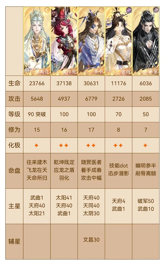 一星诸葛亮,满宠不带威刑的打法。这个攻击力的月英刚需诸葛亮dot完美盘。没有飞龙的话,只能看拉满黄月英攻击和辅星配置能不能弥补。张闿低练度活不下去的刚需董奉着手盘、满宠剐骨盘。黄月英核心羽化乾坤,不需要应龙之盾。