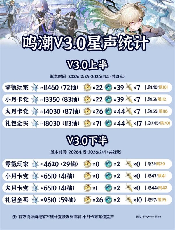 实际可获取星声数量,仍需以版本正式上线后的活动、任务与补偿为准,后续若追加活动或临时福利,总抽数仍有上浮空间。具体抽数请参考下图,总的来说零氪党在整个大版本中可获得大约171抽,其中131抽为限定抽数。