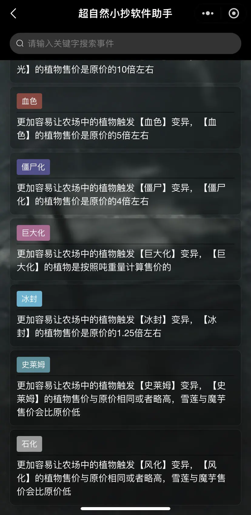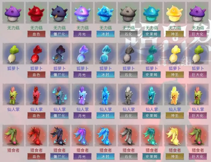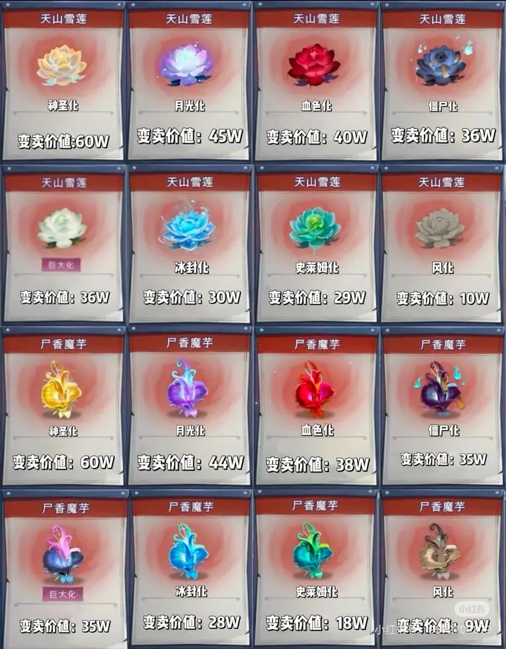神圣17倍、月光10倍、血色5倍、僵尸4倍、巨大化1.5到5倍浮动按吨卖,冰封1.5倍,石化和史莱姆预计1.25倍,但是学联和魔芋石化和史莱姆后价格是亏损的。