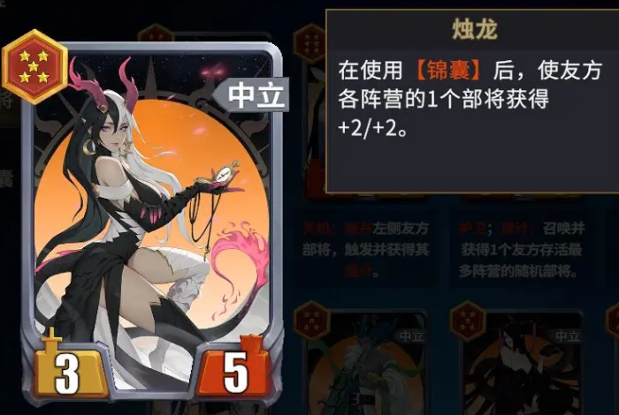 中立阵营是新手过渡阶段的优质选择,推荐以烛龙为核心构建体系。该卡牌不仅提供稳定的锦囊触发效果,还能联动白泽——当己方锦囊卡数量达到10张时,白泽每回合提供的后勤加成将显著加速烛龙与麒麟的成长节奏。标准配置可采用烛龙、李白、霍去病、王翦四人组,辅以麒麟担任主力输出。此外,第六位建议预留为功能型卡位,月兔在此位置能提供持续增益,但并非唯一解:任何具备属性强化、行动增效或资源补充能力的增益类卡牌均可替代,强调实用性与可替换性。