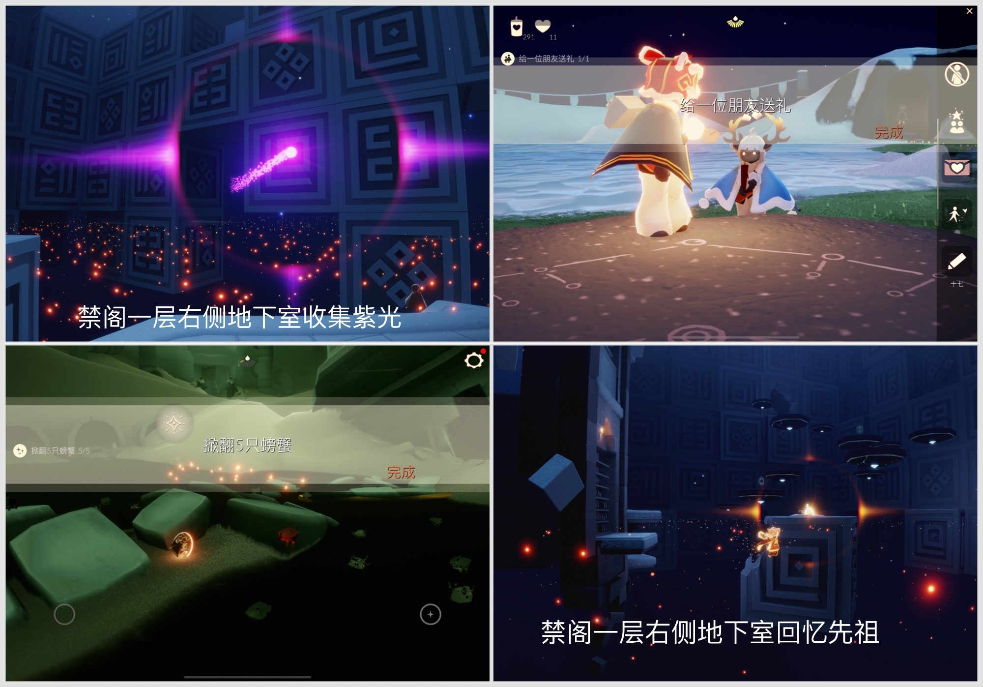 任务①收集紫色光芒:进入禁阁右侧双人门地下室收集紫色光芒即可玩成!