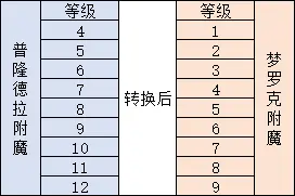 当前附魔等级需要达到4级后才能转换到下一级,同时使用的附魔材料也将变成下一级的材料,例:普隆德拉4级附魔就能转换成1级梦罗克附魔,下图为详细转换的等级