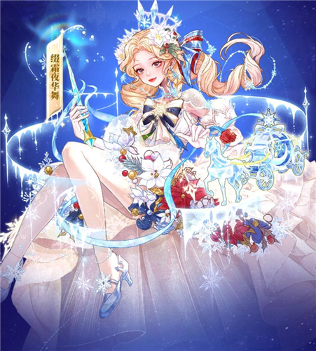 本次六星时装是独特的梦幻童话风格,女性时装名为“缀霜夜华舞”,她身穿华丽的白色礼服,头顶白色水晶的王冠,裙摆点缀着花朵,而在她的周身环绕着一辆水晶质感的南瓜马车,脚上还有一双精致的水晶鞋。