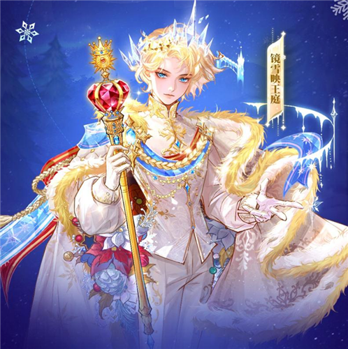 男性时装名为“镜雪映王庭”,他手上持着镶嵌着红宝石的权杖,装饰着白色与金色两种毛领的披风与华丽的金色麦穗绶带,无一不彰显了他华贵非常的身份,犹如童话故事走出的矜贵的王子。