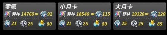 零氪:14760菲林≈92抽。小月卡:18540菲林≈115抽。