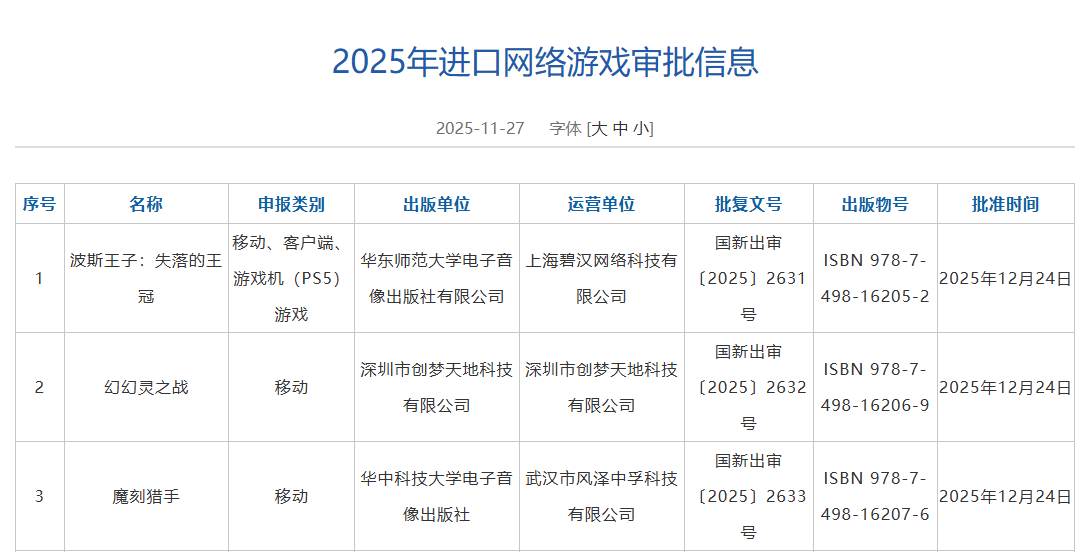 新一批进口网络游戏版号发放,本次共有3款游戏通过审批,《波斯王子:失落的王冠》等3款游戏过审。