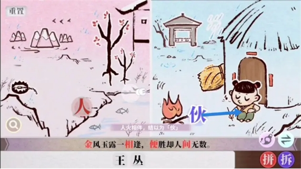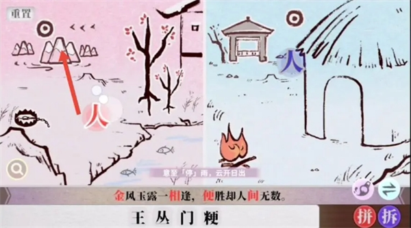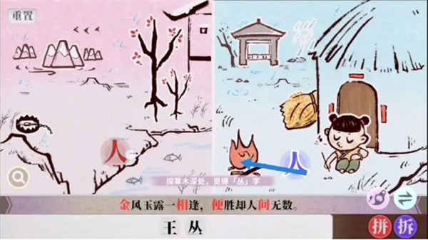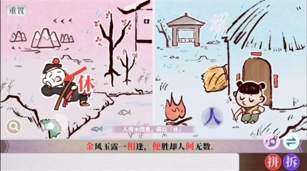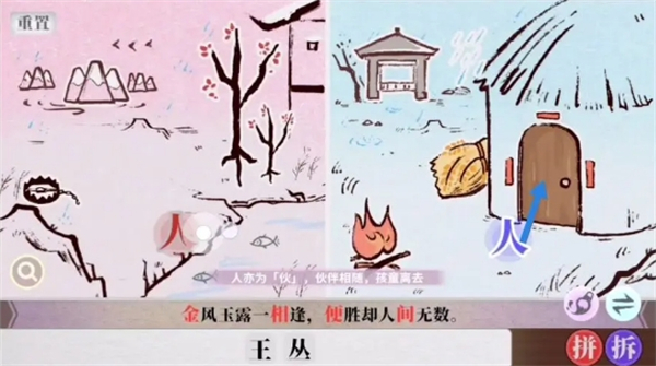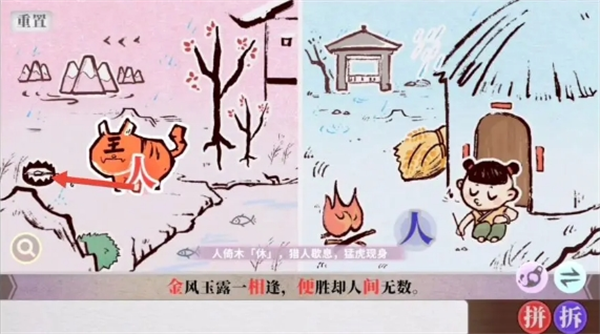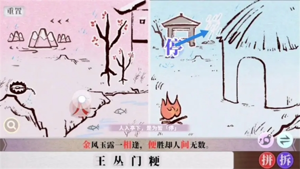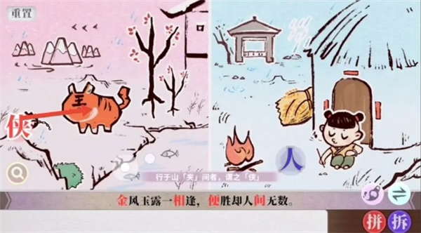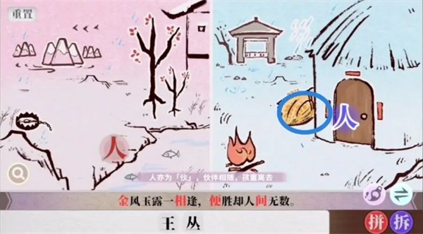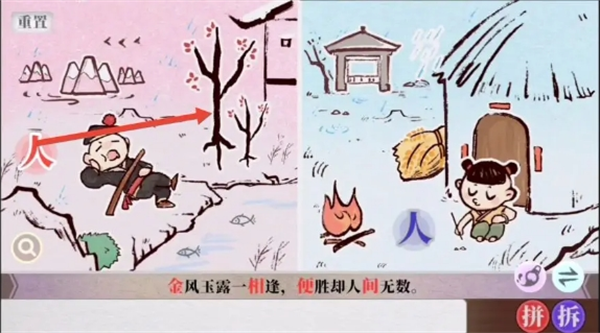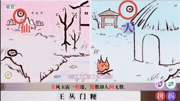 字里人间游戏的第二关就是需要玩家在场景中找字、拆字最后完成“金风玉露一相逢,便胜却人间无数”,玩家需要仔细观察场景避免遗漏,以下是具体的完成方法分享。