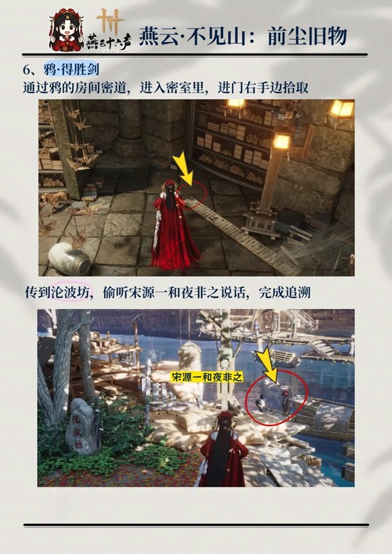 通过鸦的房间密道,进入密室里,进门右手边拾取,传到沦波坊,偷听宋源一和夜非之说话,完成追溯