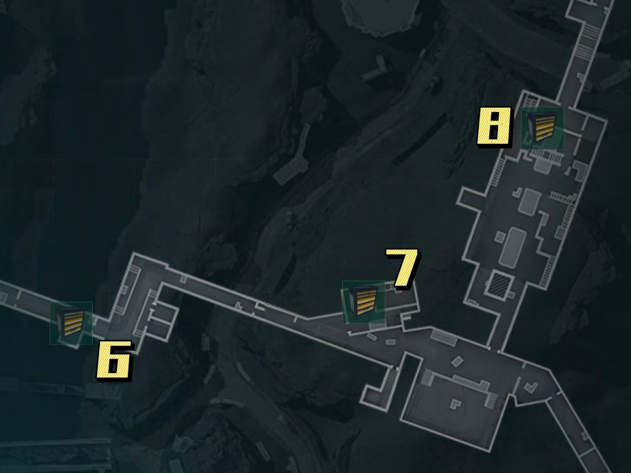 摸完5号工具柜点位之后我们可以直接走地下通道,看到墙上的带有红色阿萨拉标志的灰色破布时就可以沿着楼梯向下走,再顺着滑索过去就能看到6号工具柜了;7号工具柜有些难寻找,大家来到地图标注出来的位置之后,推开铁门进入房间内能看到是红色的墙壁,然后贴着墙壁一直走下楼梯到底层,转身能看到一个红色集装箱,7号工具柜就在集装箱旁边;8号工具柜需要刷卡才能获取到(水淹大坝无需刷卡,且模式不会影响工具柜位置,都在地图标注地点三楼红色大型管道旁边)。