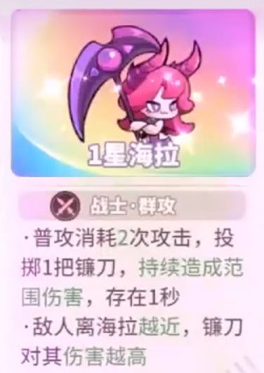 强攻流的基石角色为战士定位的海拉。其普攻消耗2点攻击次数,投掷出的镰刀不仅造成群体伤害,且可在战场停留并持续输出。更重要的是,海拉具备距离越近伤害越高的独特机制,使其在贴近敌阵时爆发力极为可观。因此,该角色应列为中期首要收集与培养目标。在天赋选择上,需规避纯伤害加成类选项,转而优先选择“疾风”等提升攻速的天赋分支,以最大化单位时间内镰刀投掷频次与持续伤害覆盖率。