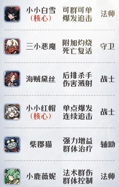 稳定输出与生存能力兼备的初始队伍,是顺利过渡前期的关键。推荐以小小白雪为核心组建六人队:三小恶魔、海贼黛丝、小小红帽、柴郡猫、小鹿薇妮。该组合获取门槛低、培养成本可控,且在1星至15星全阶段均具备实战竞争力。