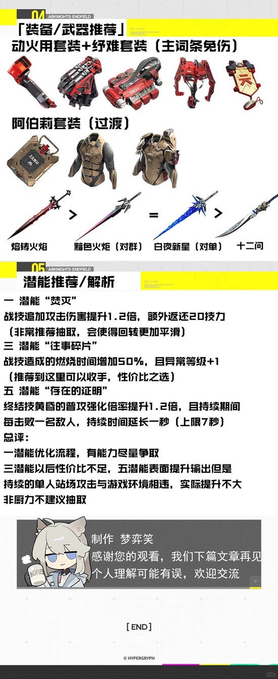 总评:一潜能优化流程,有能力尽量争取三潜能以后性价比不足,五潜能表面提升输出但是持续的单人站场攻击与游戏环境相违,实际提升不大非厨力不建议抽取