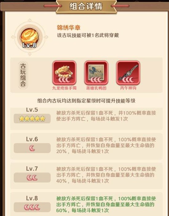 第三套组合需要九龙戏珠手镯、莲塘乳鸭图和丙午神钩三件古玩。激活后的效果非常强力:当武将被敌方击杀时,会保留1点生命值,并立即反杀出手的敌方武将,同时自身恢复60%的血量。
