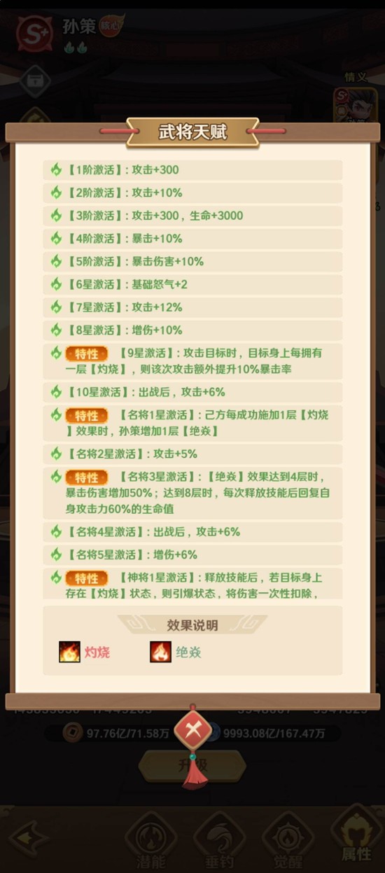 当目标身上带有灼烧状态时,这个触发概率还会额外提升5%,这使得孙策的爆发潜力巨大。灼烧状态是孙策的另一大特色,它本身不直接造成高额伤害,但能与孙策的技能和天赋产生联动。当敌方武将身上燃起灼烧火焰时,孙策的攻击更容易触发暴击。尤其是在激活九阶天赋后,每层灼烧效果都能为孙策提升暴击率,每成功施加一层灼烧,他的威胁性就会上升一个台阶。