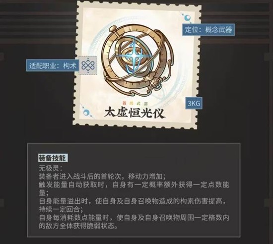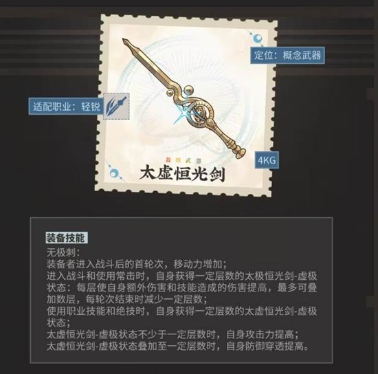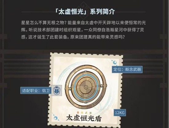 物华弥新2.6(上)版本起,博行派遣公司与「无根之木」合作推出盈级概念武器「太虚恒光」系列,共五件:盾、剑、弩、仪、炮,分属宿卫、轻锐、远击、构木、战略五大职业,统一12KG以下重量,首轮次移动力提升成为套装标签。