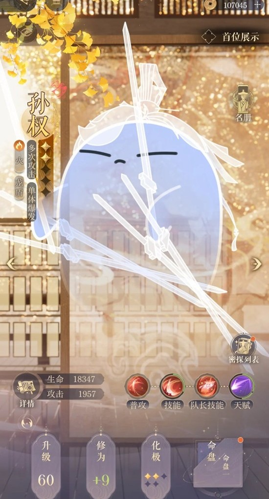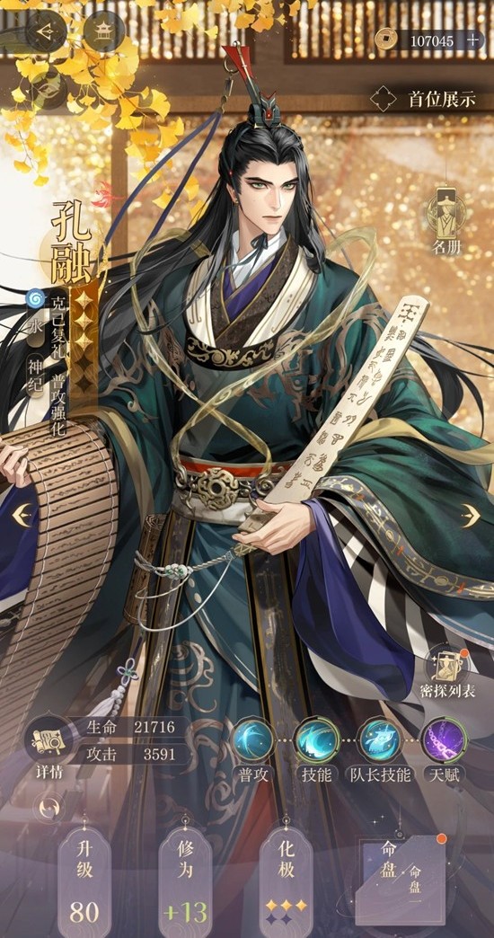 •孔融:行动后会降低队友伤害增加队友免伤(1回合),做队长有高额普攻增伤,本队起辅助和奶妈作用,每轮第一个行动的密探会给全队治疗一下,只用到孔融的天赋确保他活着就行,可以全程下拉,血量够的输出也行,但是都强制最后一个行动