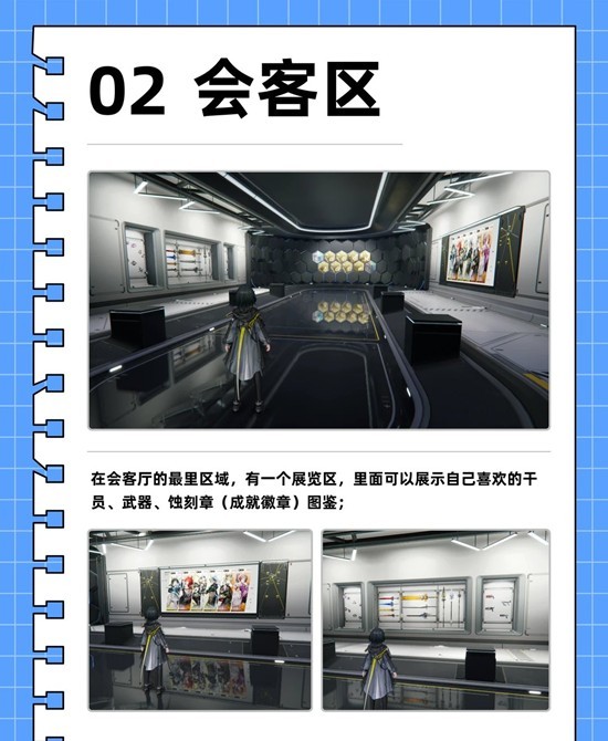 在会客厅的最里区域,有一个展览区,里面可以展示自己喜欢的干员、武器、蚀刻章(成就徽章)图鉴;
