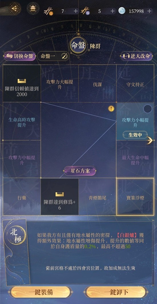 宝篆浮烟:我方只有【地水】密探时,白银炉获得额外效果,地水增伤提升护盾量*0.2%,最高50%。