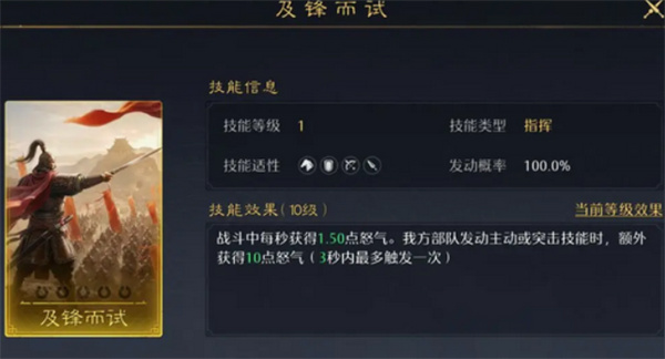 该技能是怒气队的基础循环来源,提供稳定的怒气回复效果,保证主将技能可以持续释放。