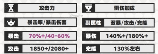 上限更高,提供100%下落攻击增幅(EA起手已叠4层后续维持5层),此时双暴就基本依赖于圣遗物主副词条与武器了。可选择‘攻击沙、雷伤/攻击杯、暴击头’。