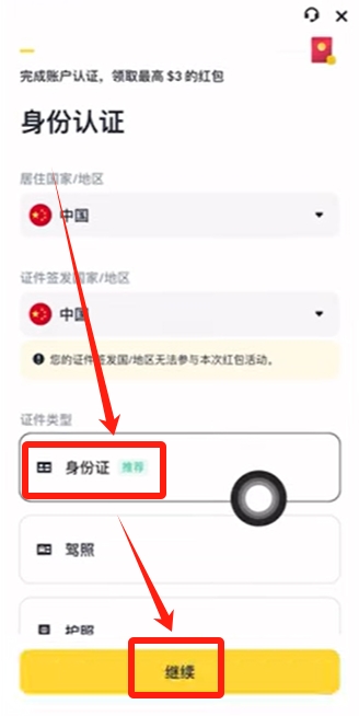 然后我们就到了身份认证的界面,接下来就需要进行身份认证了。如果你是国内的身份,可以使用身份件或者是护照来进行认证。推荐大家优先使用身份件来进行认证。然后点击【继续】。