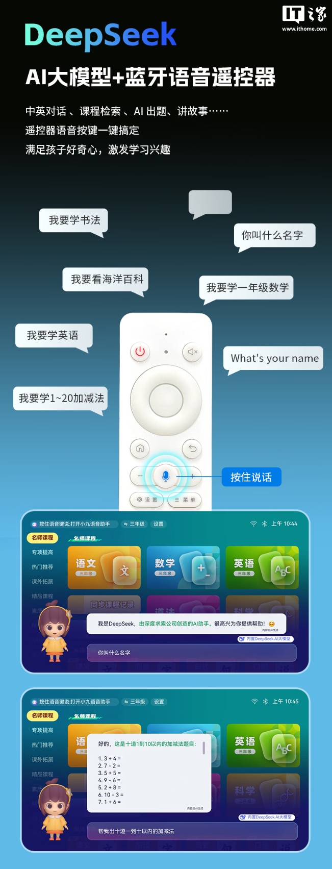 此外,知天下电视伴学机还支持 DeepSeek AI 大模型,搭配蓝牙语音遥控器,可进行中英文对话、课程检索、AI 出题等。