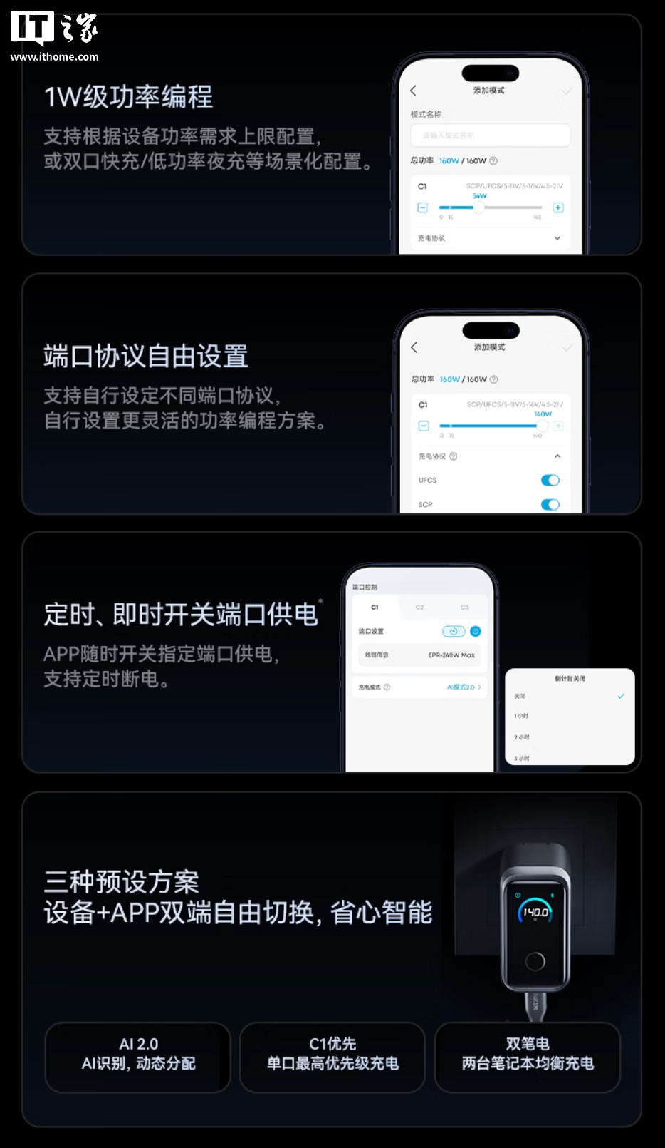 官方同时强调,该产品支持 App 智联,用户可自由设置端口功率大小、协议,支持 1W 级功率自定义分配,支持定时、即时开关端口供电。