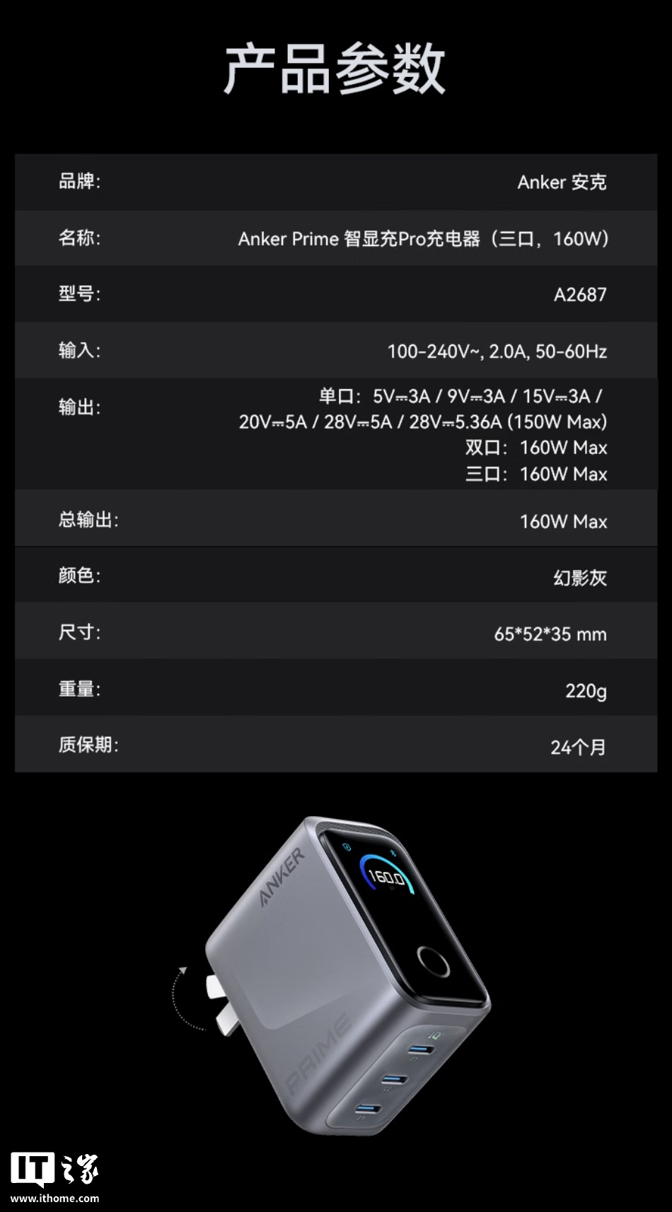 具体规格方面,该产品尺寸为 65x52x35mm,重量为 220g,提供 3 个 USB-C 接口,单口输出峰值在 140W-150W 之间,双口 / 三口峰值 160W。