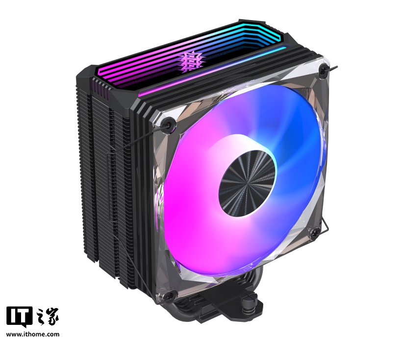 据介绍,该风冷散热器整体使用电竞风格,尺寸为 124 x 76.5×158 mm,顶部配备无限镜 ARGB 灯效顶盖,标配具有钻石切割造型的 12025 规格 HDB 液压轴承 ARGB 风扇(转速范围为 800–2000±10% RPM,最大风量 78 CFM,最大静压 3.0 mmH2O,噪音控制在 32 分贝内)。