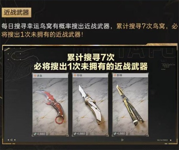 在《三角洲行动》中幸运鸟窝活动正式开启,玩家在各个地图之中探索鸟窝的时候,有概率搜索出以前的刀皮,让大家返场进行购买,接下来将为大家详细的介绍下活动详情。