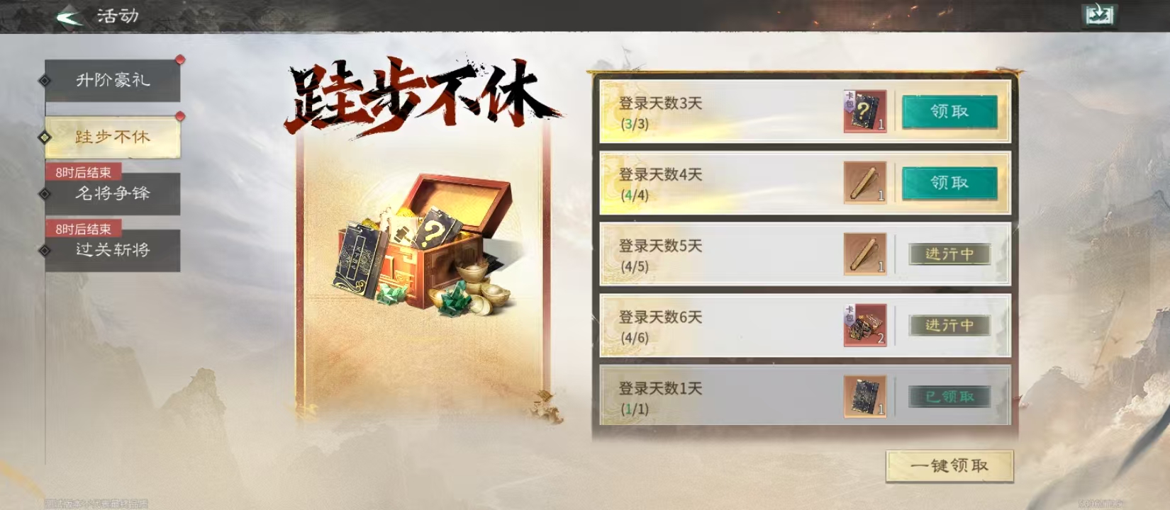 【升阶豪礼】模块支持定向武将选择,可从诸葛亮、孙尚香、赵云、关羽等核心名将中任选其一,立即解锁专属养成礼包。例如选定关羽后,将直接获得对应升级材料包,助力精准培养,避免资源错配。每日左上角“每日免费”按钮提供无门槛英雄培养素材,零消耗即可领取。各档位升阶礼包限每日限购一次,定价亲民——以诸葛亮升阶包为例,仅需少量玉髓即可兑换关键突破道具。此外,“跬步不休”登录活动持续发放道具与材料包,后续阶段还将追加进阶奖励。