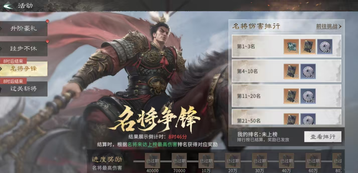 【名将争锋】采用排行榜结算机制,前三位玩家可获得50万基础资源、稀有道具及1个玉髓道具,并额外获赠50本英雄技能书;第4至第10名则可领取30万资源、30本技能书,足以支撑武将完成两次大阶级突破。冲刺榜单时建议优先选用练度较高的主力武将,确保装备等级、技能等级全部拉满,并合理搭配增益类buff,最大化单次输出伤害,从而稳定占据高排名区间。