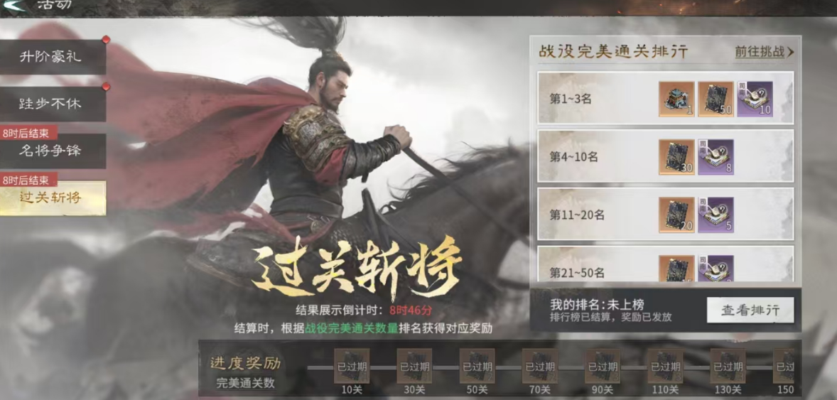【过关斩将】为通关导向型玩法,达成全关卡完美评价后,排名前三者可获得限定武将皮肤、10个限定道具及50本技能书;该皮肤不仅具备视觉辨识度,还可提升武将基础属性。第4至第10名则可获得8个限定道具与30本技能书。建议玩家梳理当前未达成完美评价的关卡,针对性调整阵容配置,确保全员存活且通关时间达标,逐步逼近榜单前列。