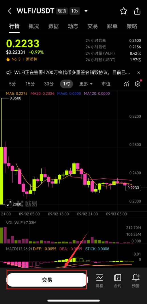打开APP点击【市场】搜索"WLFI",选择WLFI/USDT现货交易对