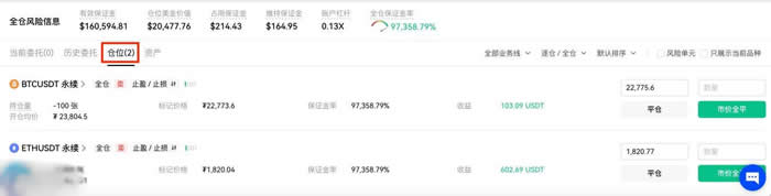 3、下单成功后,即可在交易页面下方的【仓位】和【资产】栏,即可在交易页面下方的【仓位】和【资产】栏,并观察保证金水平的降低(维持保证金、占用保证金)。