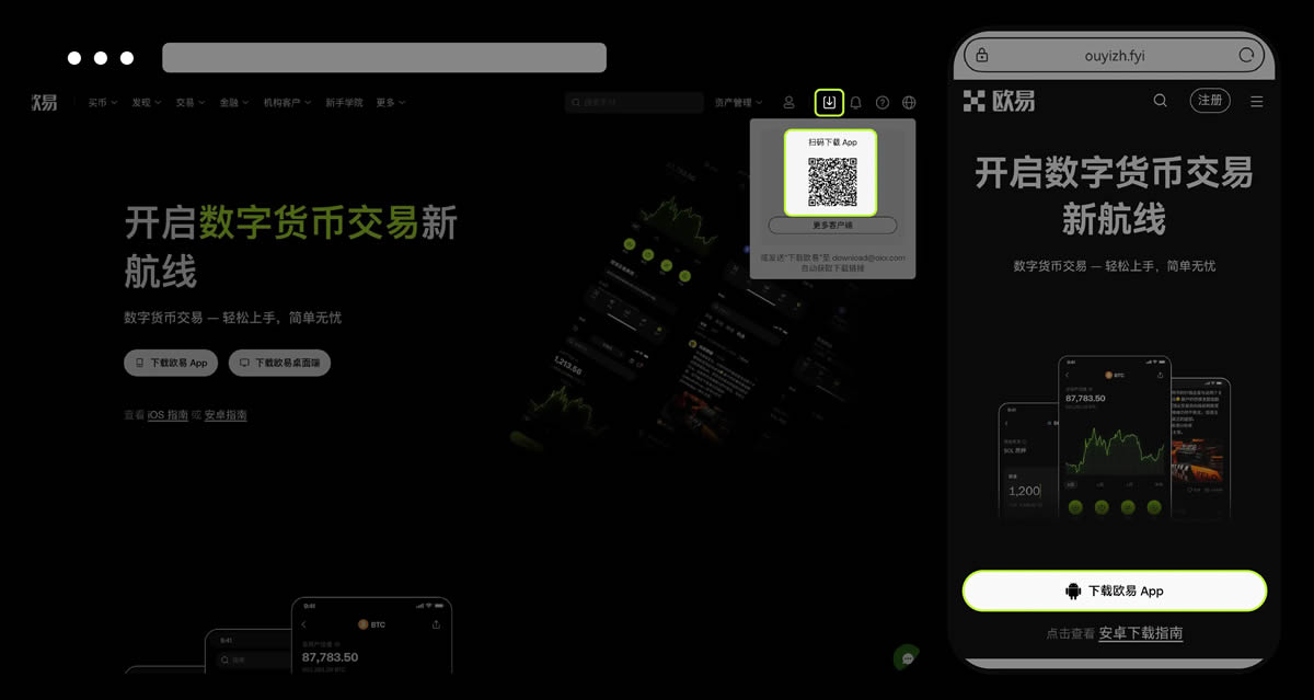 打开欧易官网(),点击下载图标,用手机扫描出现的二维码。建议使用浏览器扫码,避免微信扫码导致网页访问异常。