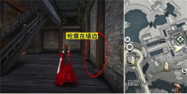 传到墨守亭,楼梯旁边拾取,获得即可完成追溯,枪靠在墙边