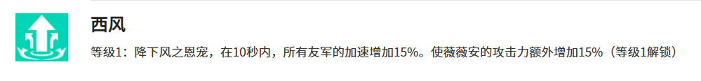 团队增益技“西风”提供全局机动性与输出协同加成:释放后10秒内,全队移速提升15%,薇薇安自身额外获得15%攻击力。随等级成长,41级时双项加成同步提升至17.5%,141级则跃升至20%移速与20%攻击力,且薇薇安额外再获10%移速提升。该技能在副本攻坚与大规模团战前预热释放,能显著优化队伍整体节奏与集火效率。
