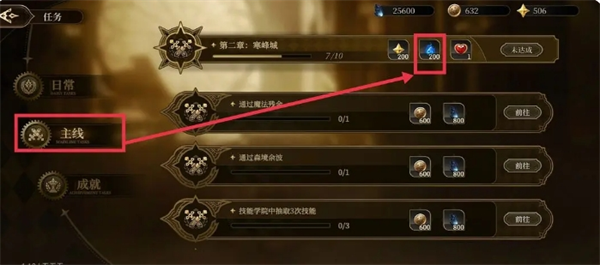 3、点击任务,找到主线任务,在主线任务中可以看到有技能点奖励的任务,完成就可以了