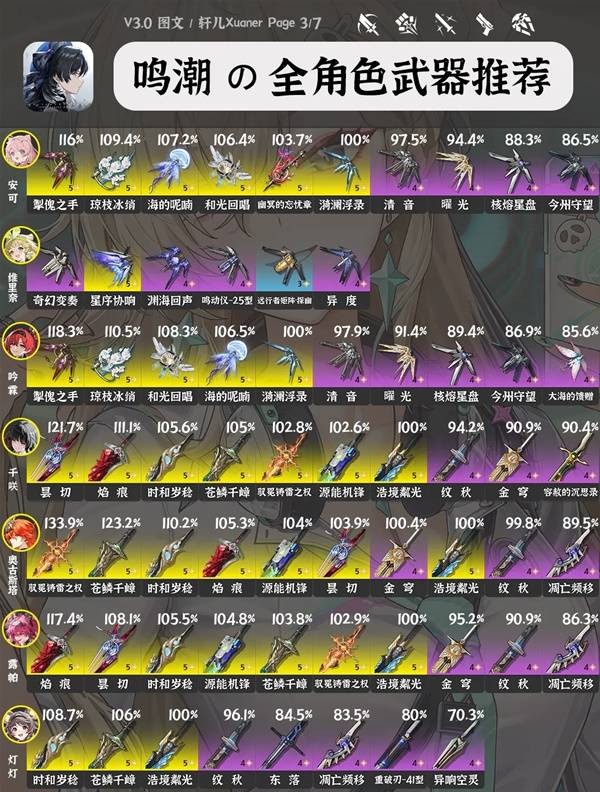 ②武器右上方百分比数字为角色携带该武器个人伤害体现,以1阶常驻五星武器为100%基准。武器按照优先级排序。