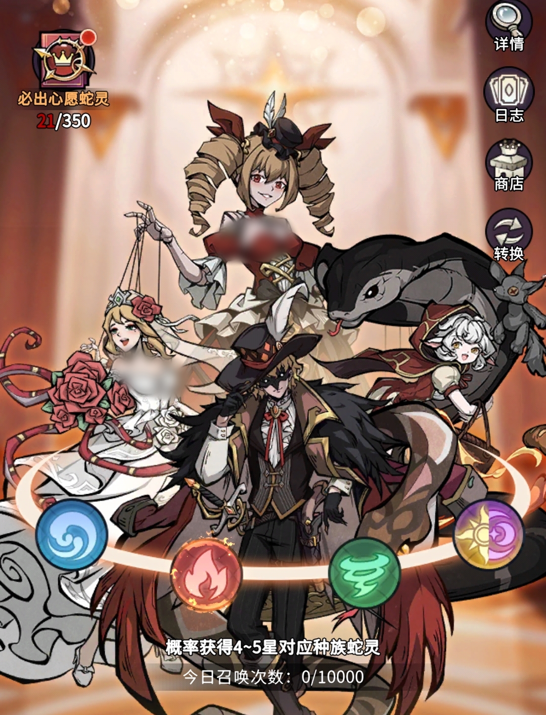 蛇灵召唤是人们最常用的许愿树功能,各位可在里边进行蛇灵的抽取。它分为基础召唤、高级召唤和友情召唤三种,其中基础召唤使用蛇鳞来抽取,可抽出2至5星蛇灵,高级召唤则用蛇牙来抽取,只会出现3至5星蛇灵。友情召唤需要消耗好友增送给自己的金玫瑰,100朵金玫瑰可进行一次抽取,与基础召唤一样能抽出2至5星蛇灵。