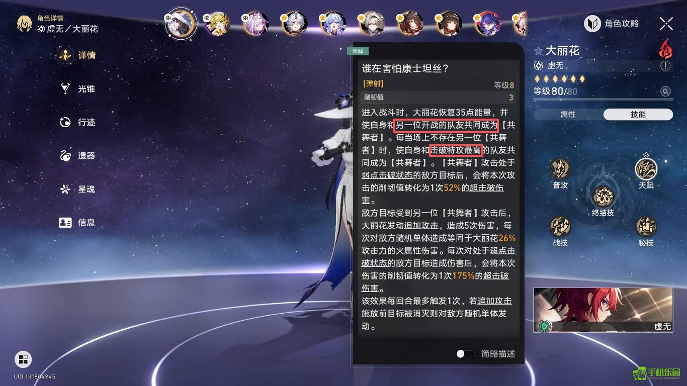 进入战斗时,大丽花恢复35点能量,并使自身和另一位开战的队友共同成为[共舞者]。每当场上不存在另一位[共舞者]时,使自身和击破特攻最高的队友共同成为[共舞者]。
