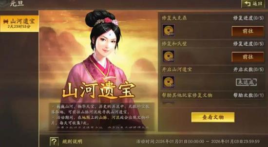 限时玩法“山河遗宝”将于2026年1月1日0点至1月3日24点开放。参与活动的门槛是历史势力值达到300点,满足条件的玩家即可进入活动专属地图。每天凌晨0点,系统会在全服地图的山脉与河流区域随机刷新遗宝点位,玩家点击开启即可获得文物碎片。