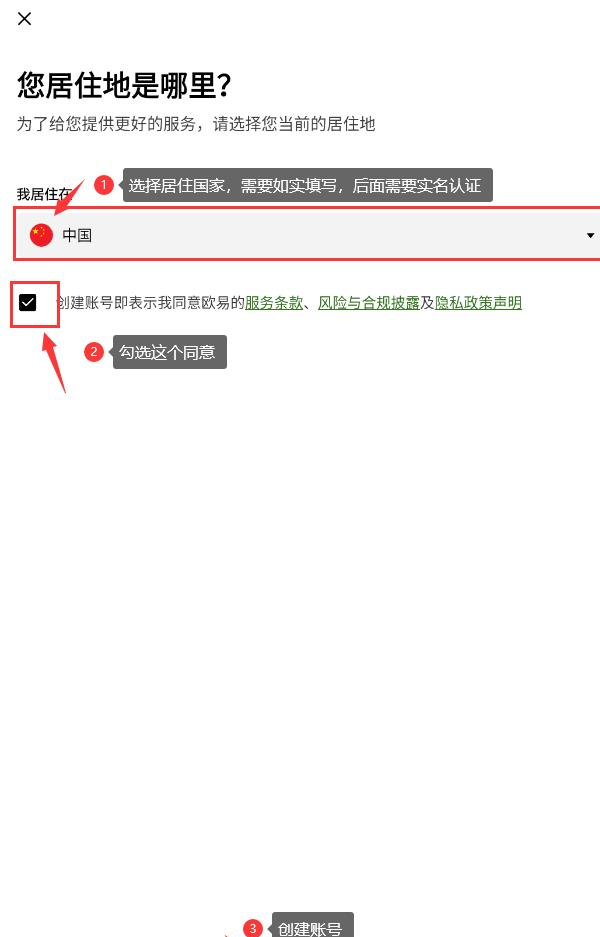 3、请确认您的居住地址与所选国家相符,这一点对于后续的身份验证至关重要,因为身份件件上的地址需要与此匹配。