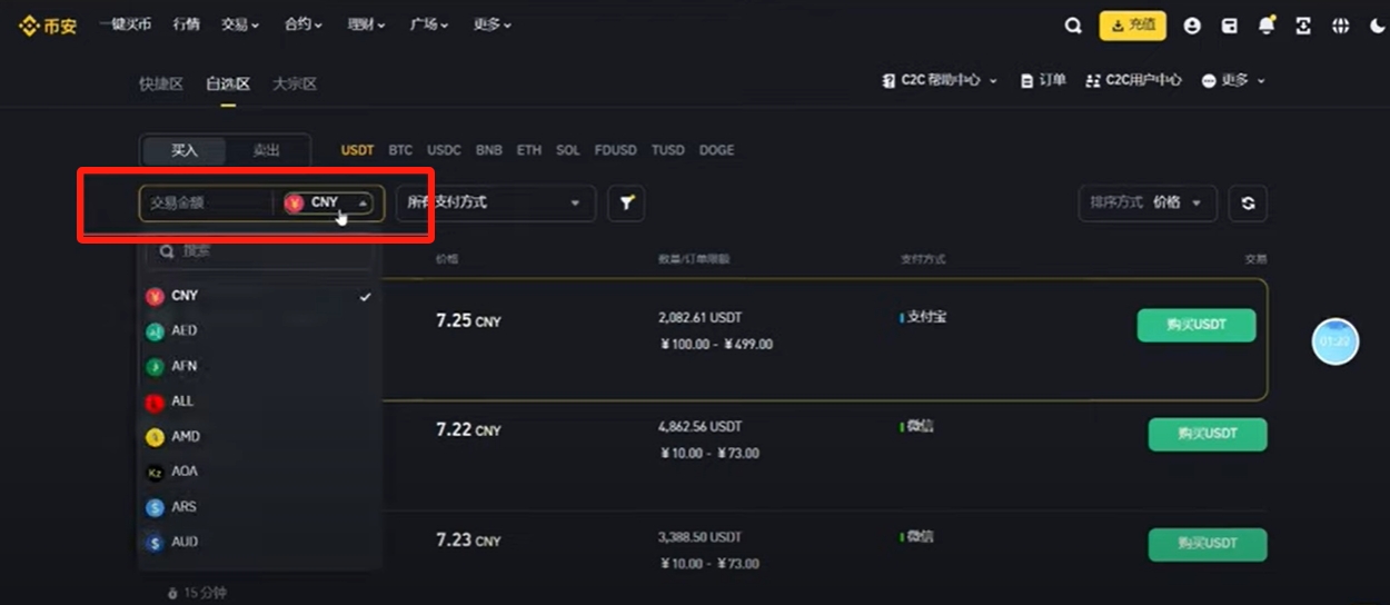 我们选择完币种之后再筛选一下金额,后面这个就是软妹币的意思,就是我们要使用的法定货币,同样你可以在这里切换你要使用的法定货币,我们就使用这个软妹币。
