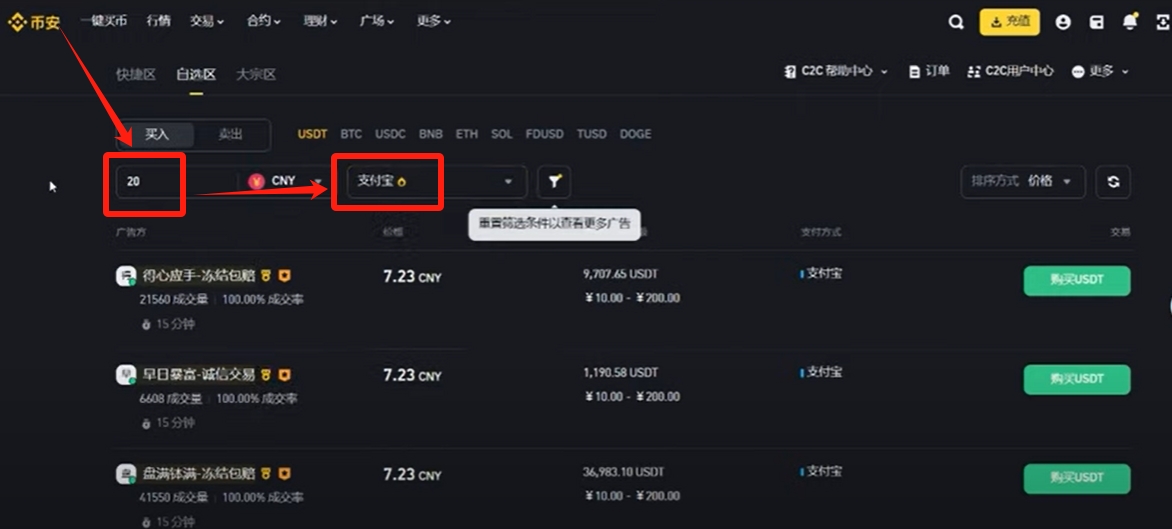 我们来筛选一下金额,比如说我想要购买20元软妹币的USDT,那我就直接输入20。然后在后面筛选一下支付方式,大家可以看到这里面有支付宝、储蓄卡还有微信这三种支付方式,你习惯使用哪种方式支付,你就使用哪种方式支付,比如说我习惯使用支付宝,那我就勾选“支付宝”。