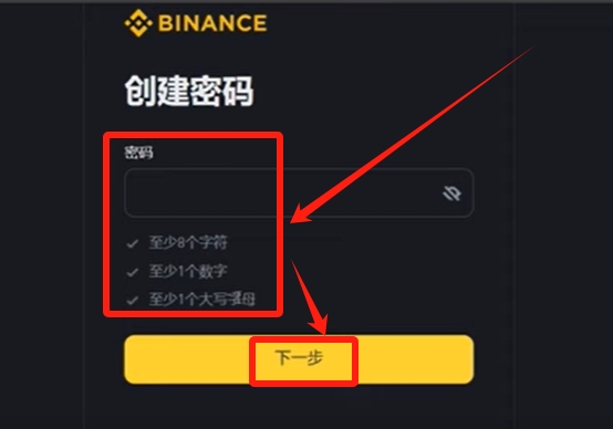 确认好之后,他自动跳转到了创建密码的页面。这里的密码创建有三个要求,至少8个字符,至少一个数字,至少一个大写字母,我们就按照他的要求,设置一个高强度的密码,点击【下一步】。
